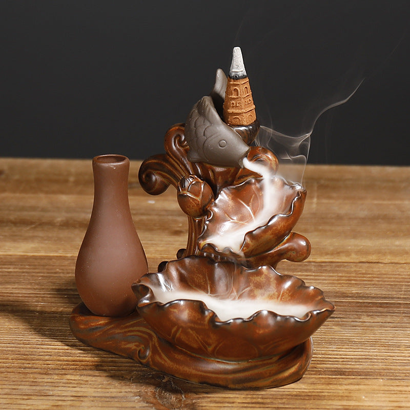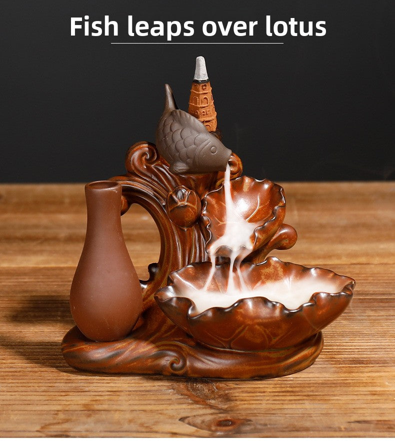 New ceramic backflow sandalwood burner, antique fish leaping lotus rose ornamental smoke backflow aromatherapy burner home ornament