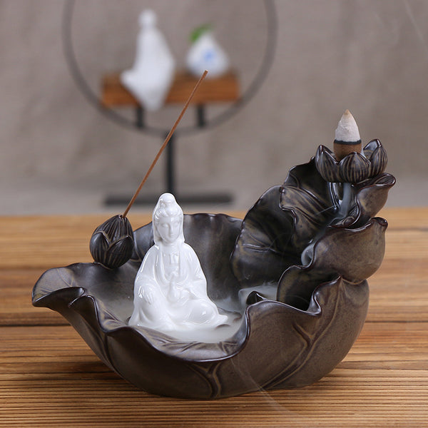 Ceramic backflow sandalwood burner tower, creative large lotus leaf Tathagata ornament, smoke backflow incense burner incense insert